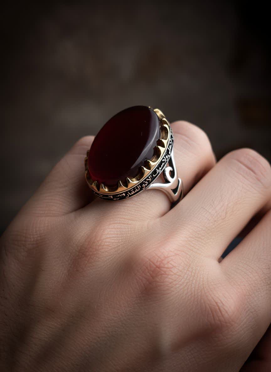 👈 : انگشتر عقیق سرخ منقّش به نام امیرالمؤمنین(ع)، رنگ غیرت و وقار علوی روی دستانت است؛ هرکه دارد، دل عالم را به تسخیر میکشد.