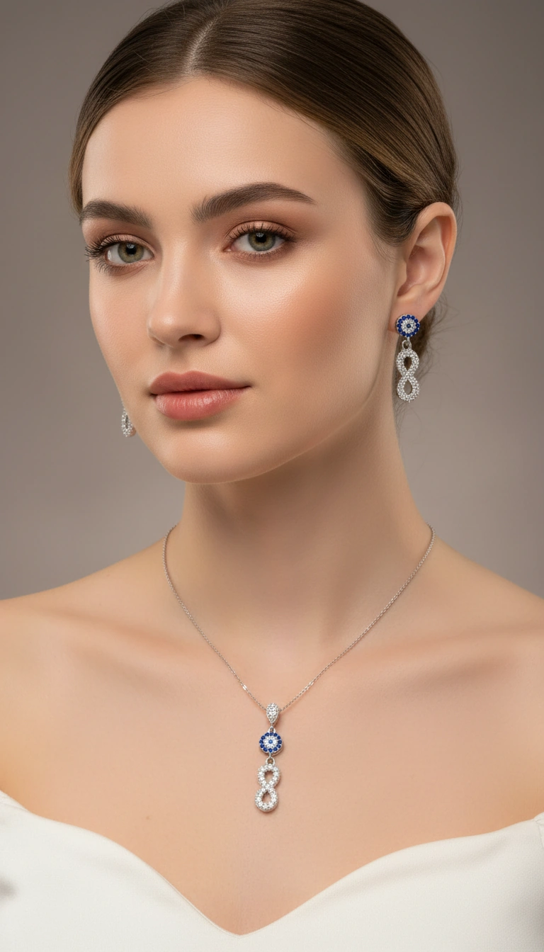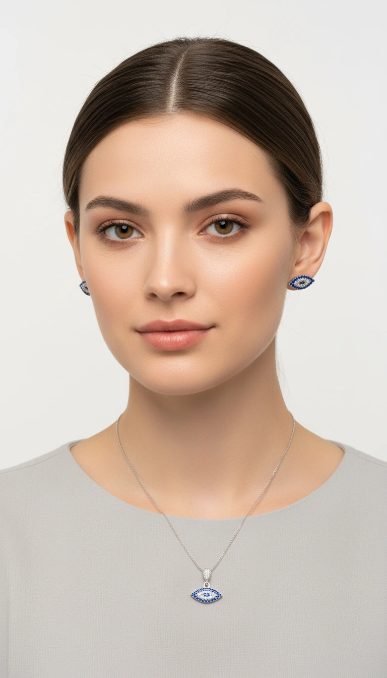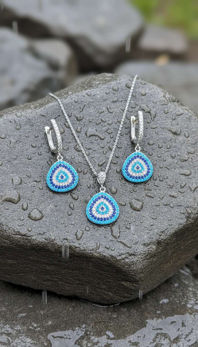 نیم ست زنانه ، نقره 925 ، آبکاری رادیوم ، طرح چشم نظر لوزی ، برند نقره بقیع