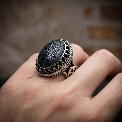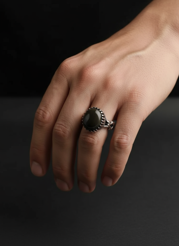 انگشتر مردانه ، نقره عیار 925، سنگ حدید صینی ، طرح رکاب صفوی ، توصیه شده اهل بیت علیهم السلام ، نقره بقیع