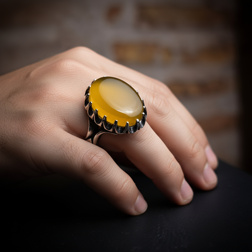 انگشتر مردانه . نقره عیار 925 . طرح رکاب : صفوی . سنگ عقیق زرد . مناسب دست های ظریف . نقره بقیع