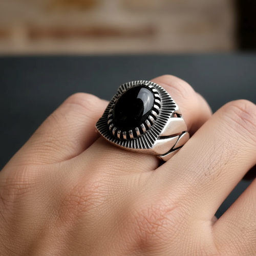 انگشتر مردانه ، نقره عیار 925، سنگ عقیق جزع یمن، طرح رکاب رولکس ، نقره بقیع