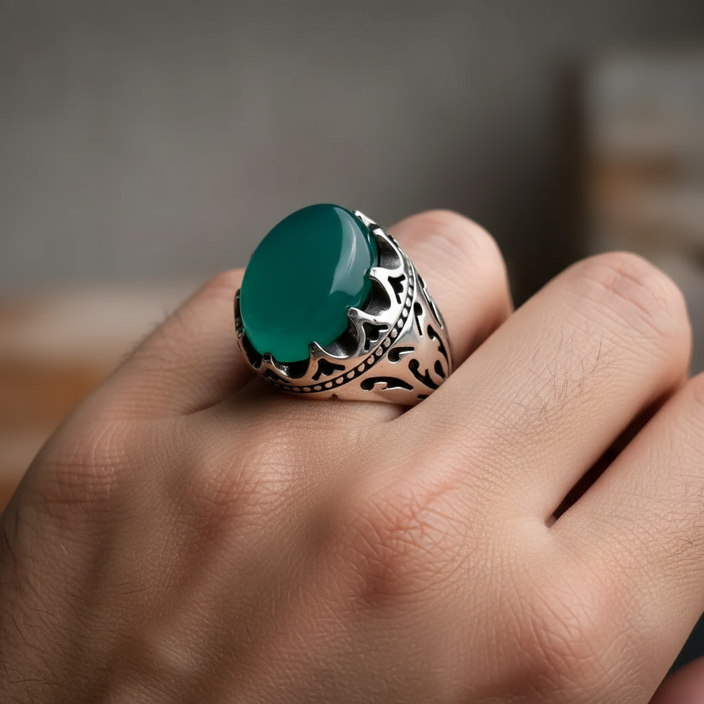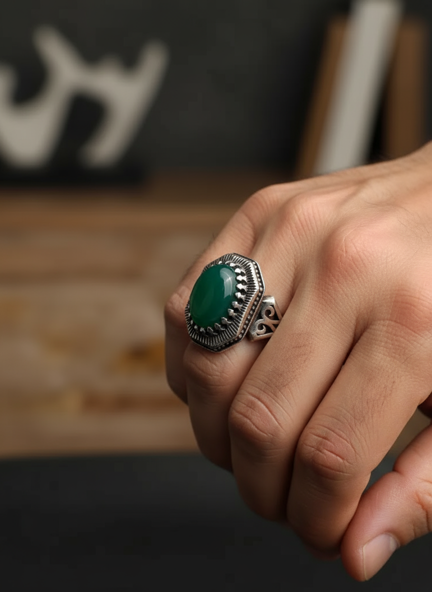 انگشتر مردانه . نقره عیار 925 . طرح رکاب : صفوی و اشک . سنگ عقیق سبز . خیلی جذاب . نقره بقیع
