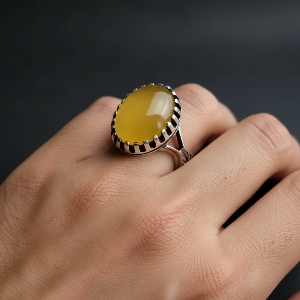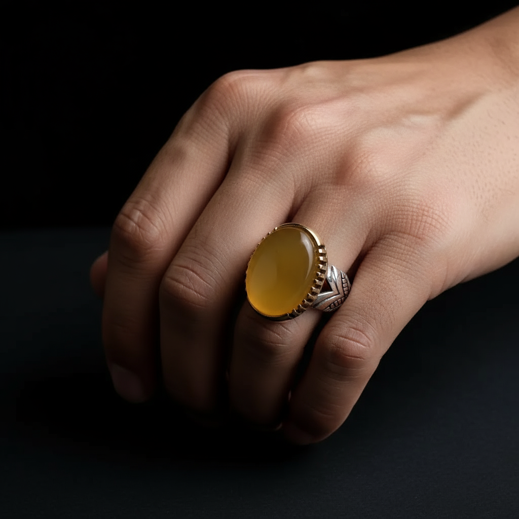 انگشتر مردانه . نقره عیار 925 . طرح رکاب : صفوی . سنگ عقیق زرد . مناسب دست های ظریف . نقره بقیع