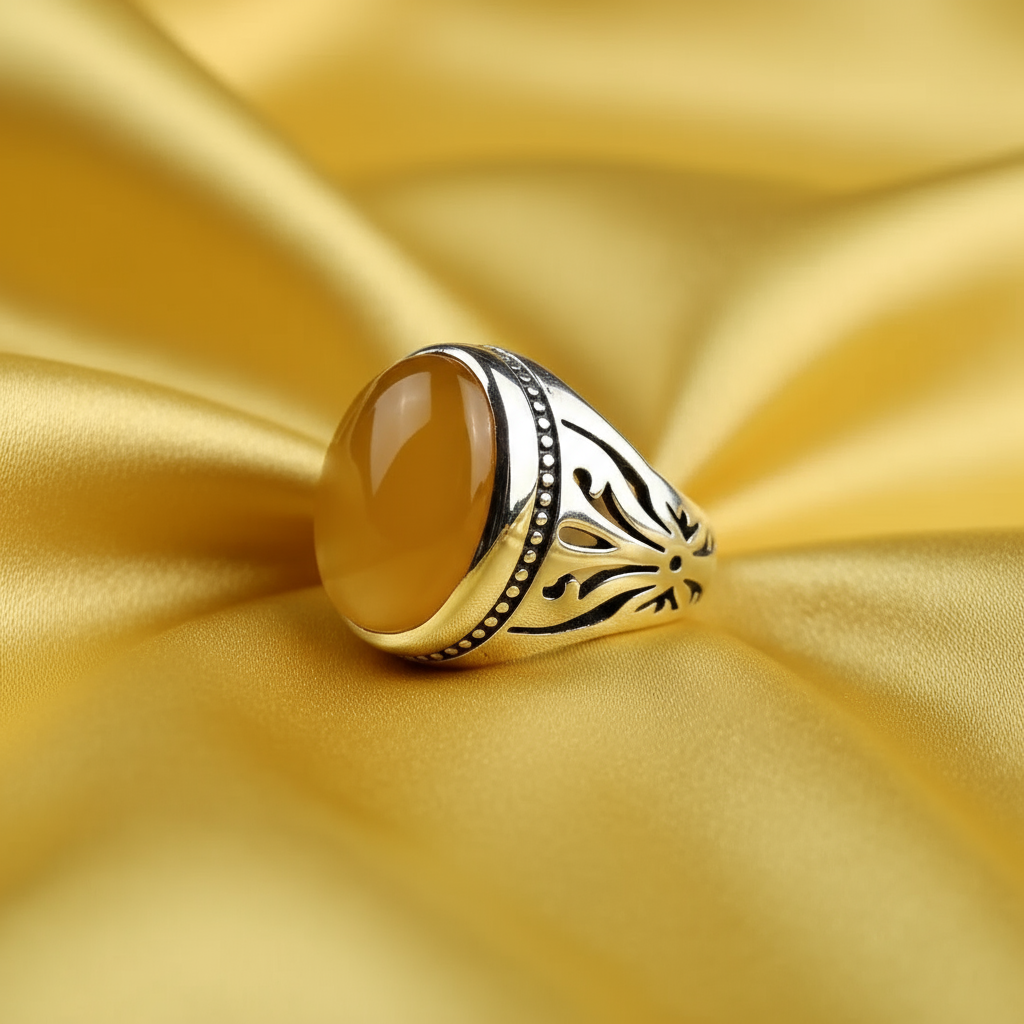 انگشتر مردانه ، نقره عیار 925، سنگ عقیق زرد، طرح رکاب صفوی و برگ ، نقره بقیع