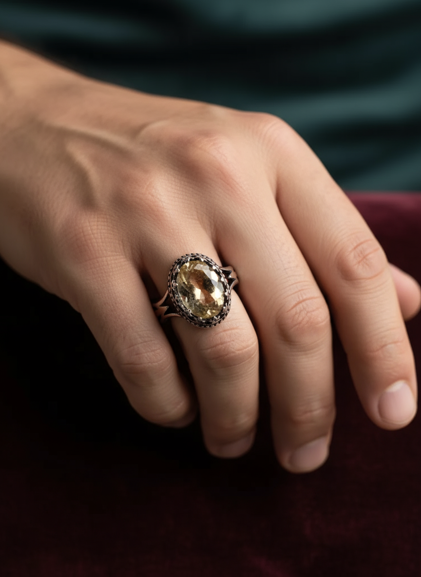انگشتر مردانه ، نقره عیار 925، سنگ سیترین جواهراتی، طرح رکاب سر نیزه ای، نقره بقیع