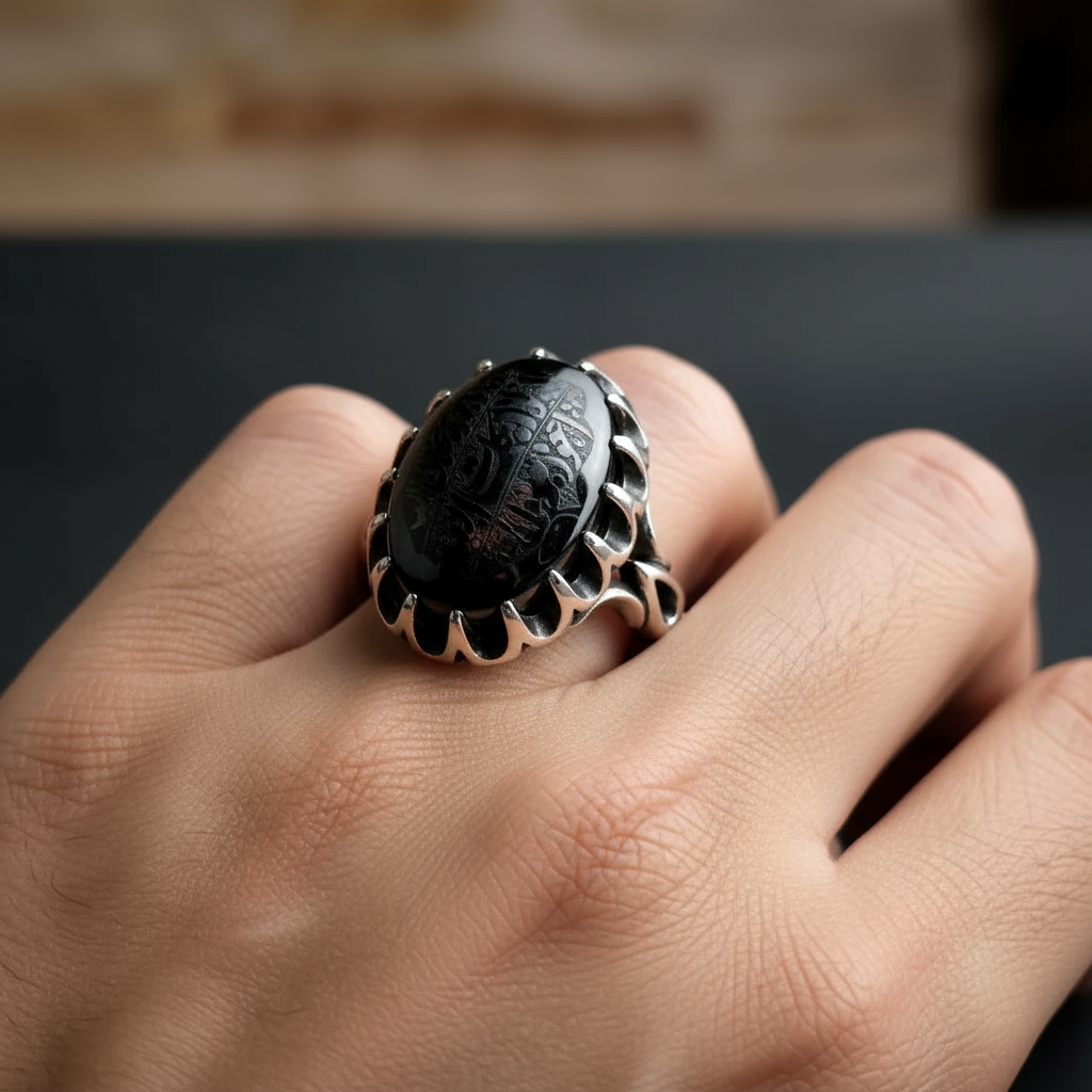 انگشتر مردانه ، نقره عیار 925، سنگ حدید صینی ، طرح رکاب صفوی ، توصیه شده اهل بیت علیهم السلام ، نقره بقیع