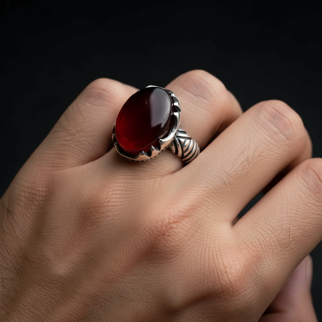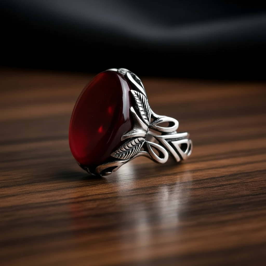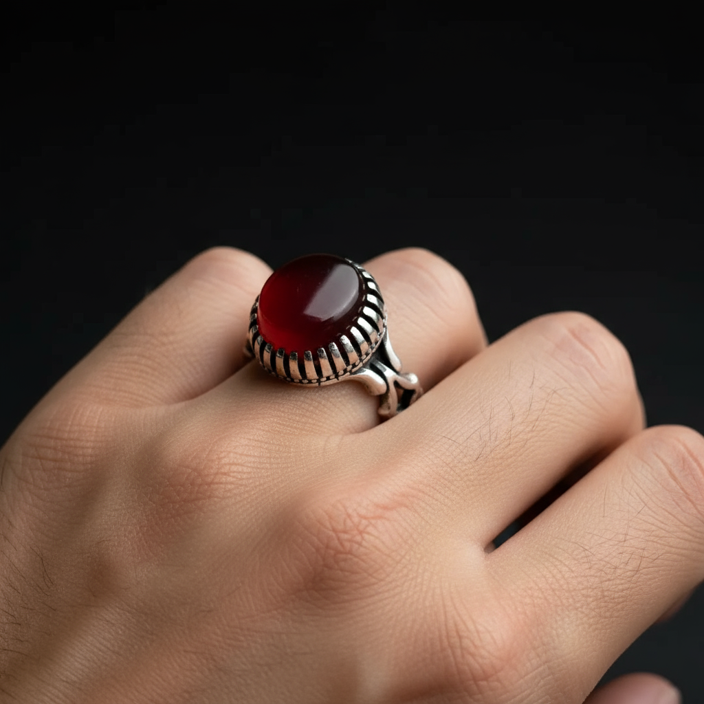 انگشتر مردانه ، نقره عیار 925، سنگ عقیق سرخ ، طرح رکاب فیلی ، نقره بقیع