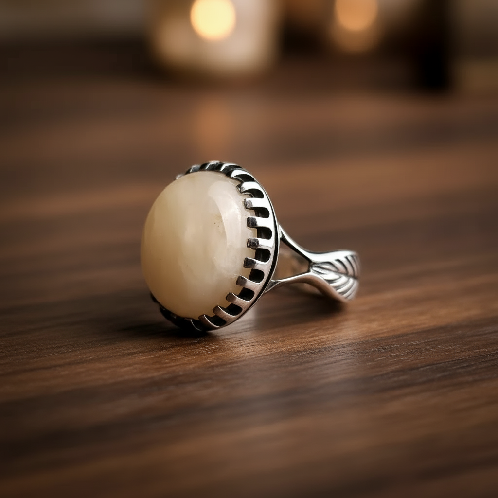 انگشتر مردانه ، نقره عیار 925، سنگ یشم افغان، طرح رکاب صفوی ، نقره بقیع