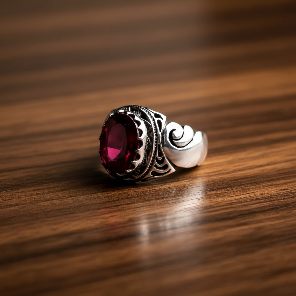 انگشتر مردانه ، نقره عیار 925، رکاب دست ساز ، سنگ یاقوت سرخ گرید ۱ ، طرح رکاب فیلی ، نقره بقیع