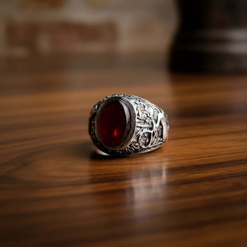 انگشتر مردانه . نقره عیار 925 . طرح رکاب : فیلی و منقش به ذوالفقار . سنگ عقیق سرخ . مناسب برای جوانان . نقره بقیع