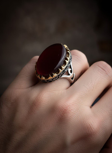 انگشتر مردانه . نقره عیار 925 . نگین عقیق سرخ . طرح پایه رکاب : مزین و منقش به علی . طرح دور دهنه رکاب مزین به { لا فتی الا علی لا سیف الا ذوالفقار }. ترکیب اصالت و هنر یه همچین اثری پدید آمده . نقره بقیع