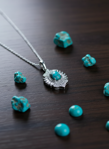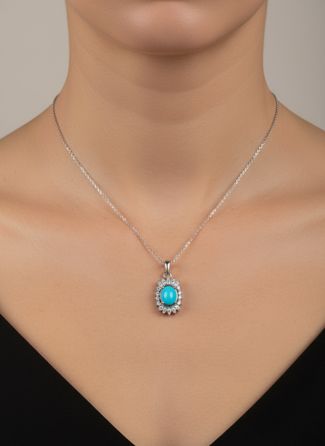 گردنبند زنانه ، نقره عیار 925 ، آبکاری رادیوم ، سنگ فیروزه نیشابور، نقره بقیع