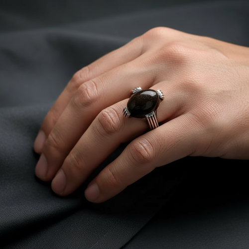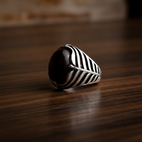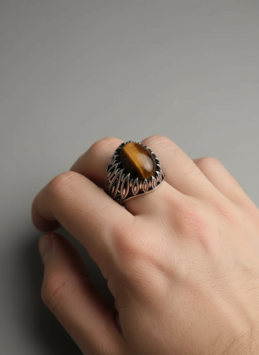 انگشتر مردانه ، نقره عیار 925، سنگ چشم ببر «تایگر» ، نقره بقیع