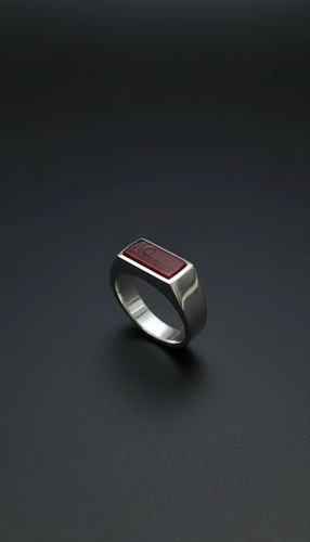 انگشتر مردانه . نقره عیار 925 . نگین عقیق سرخ . طرح پایه رکاب : مزین و منقش به علی . طرح دور دهنه رکاب مزین به { لا فتی الا علی لا سیف الا ذوالفقار }. ترکیب اصالت و هنر یه همچین اثری پدید آمده . نقره بقیع
