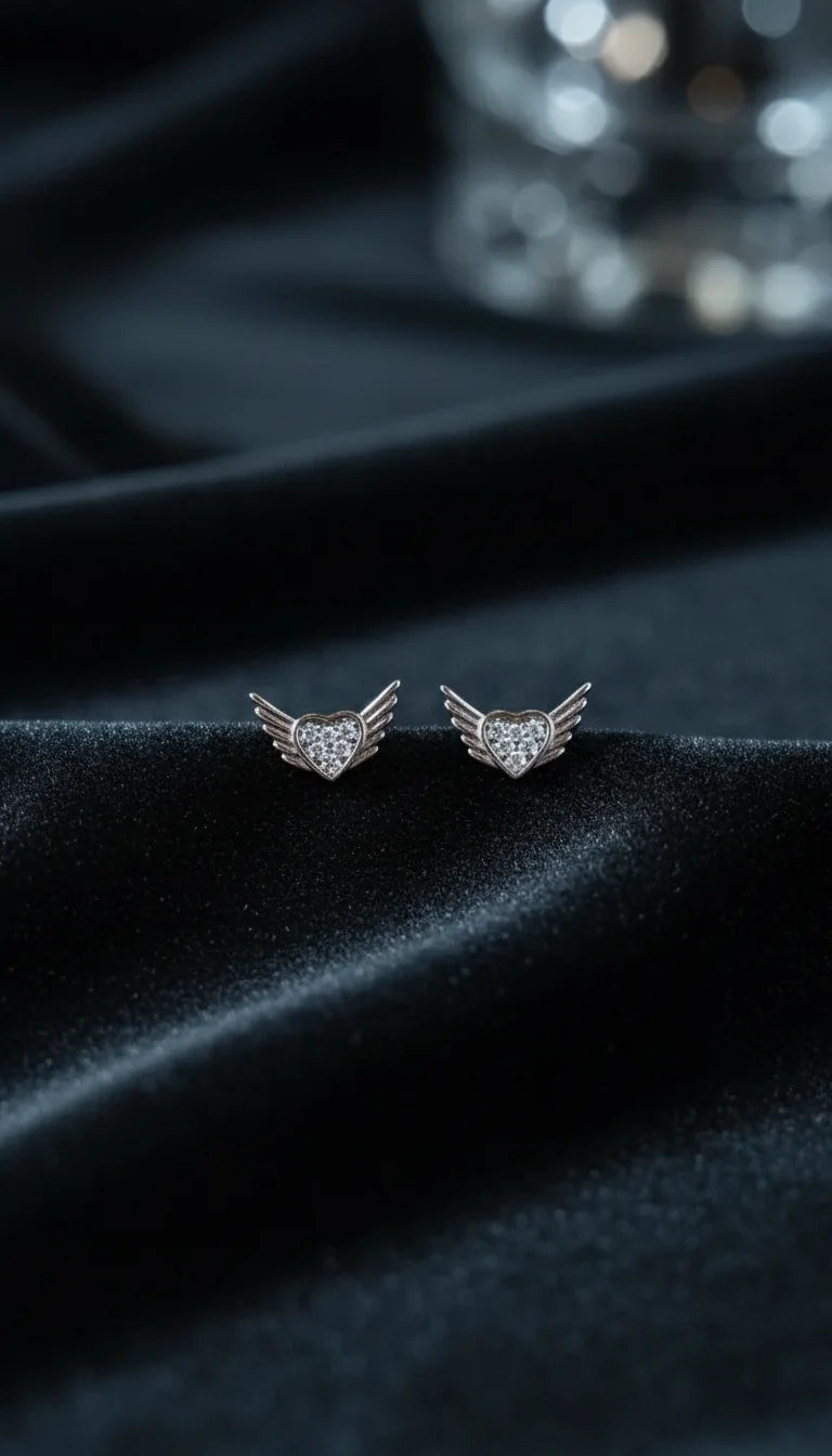 وسط گوشواره یه قلب درخشان پر از نگینهای ریز و براق جا خوش کرده و از دو طرفش بالهای ظریف و مجلسی کشیده شدن که حس آزادی و عشق رو همزمان به تصویر میکشن 🪽💕