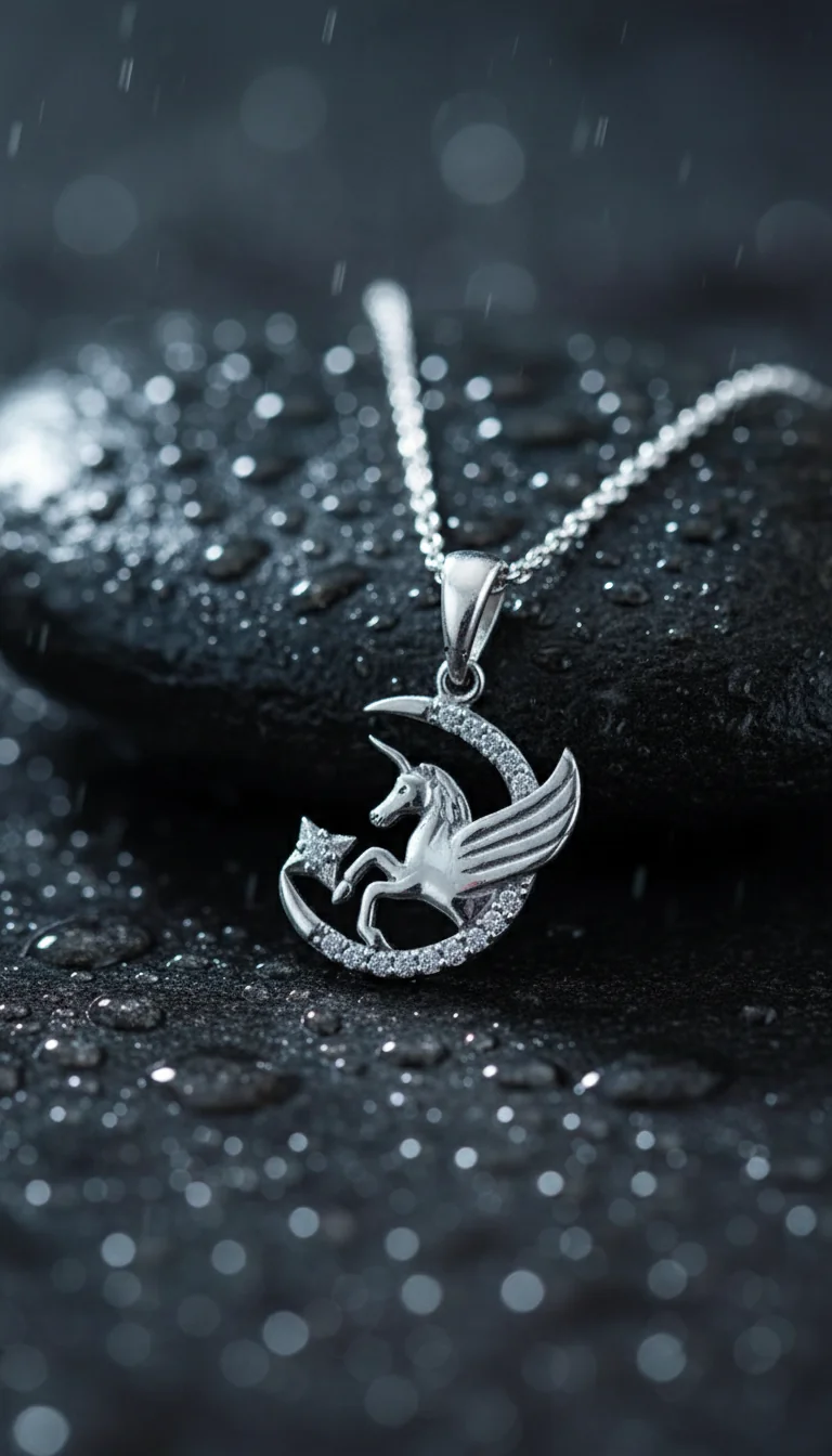 طراحیش یه ماه هلال نگینکاری شدهست که یه یونیکورن بالدار با جزئیات ظریف و لطیف داخلش ایستاده، رو به ستارهای درخشان ✨. این ترکیب، حس جادویی دنیای خیال رو میاره جلوی چشم آدم، انگار یه قصه قشنگ رو داری به گردنت میزنی 🦄💫.