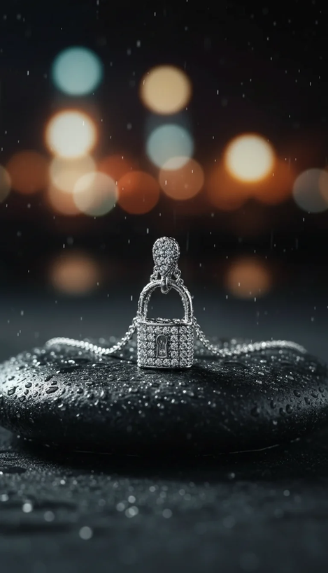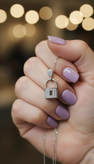 آویز اون به شکل یه قفل ظریف و کوچیکه که سطحش پر از نگینهای ریز و درخشان شده 💎، طوری که هر حرکتش زیر نور مثل ستارهها میدرخشه 🌟.