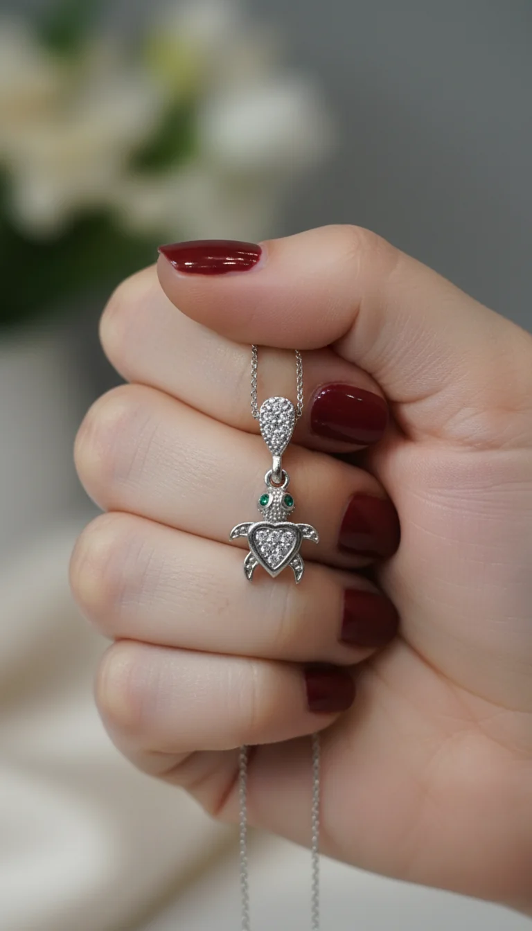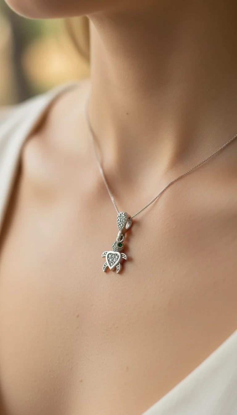 گردنبند نقره ۹۲۵ لاکپشت نگیندار 🐢💎💚 – نماد آرامش و شیکپوشی