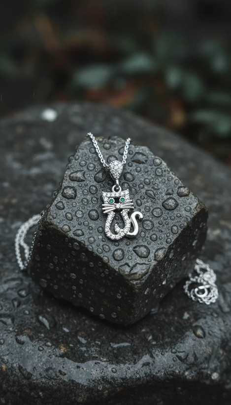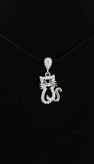گردنبند نقره ۹۲۵ اصل به شکل یه گربه کوچولوی باحال طراحی شده، که کلهش از یه قلب پر از نگینهای ریز و درخشان ساخته شده. 😻 چشمهاش دو تا سنگ سبز زمردی خوشرنگه که وقتی نور میخوره، برقش آدم رو میخکوب میکنه. فرم سبیلها و دم خمیدهاش هم کلی بهش شخصیت داده، انگار داره با شیطنت نگات میکنه! 💎✨