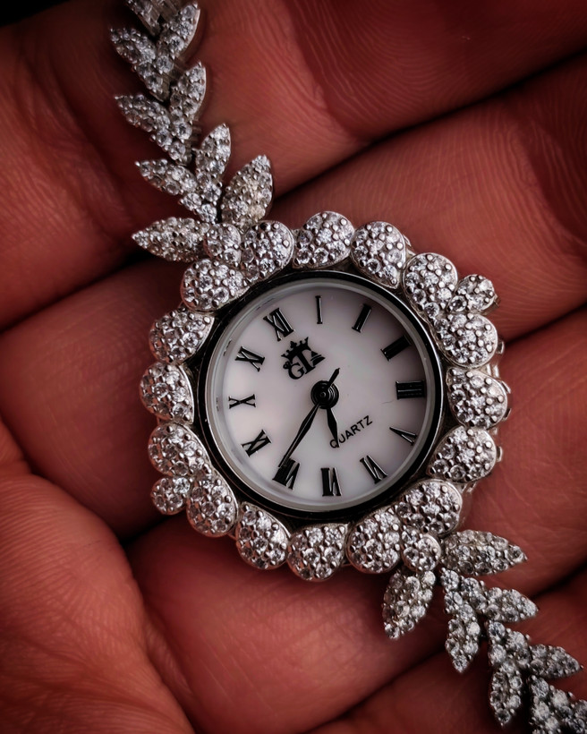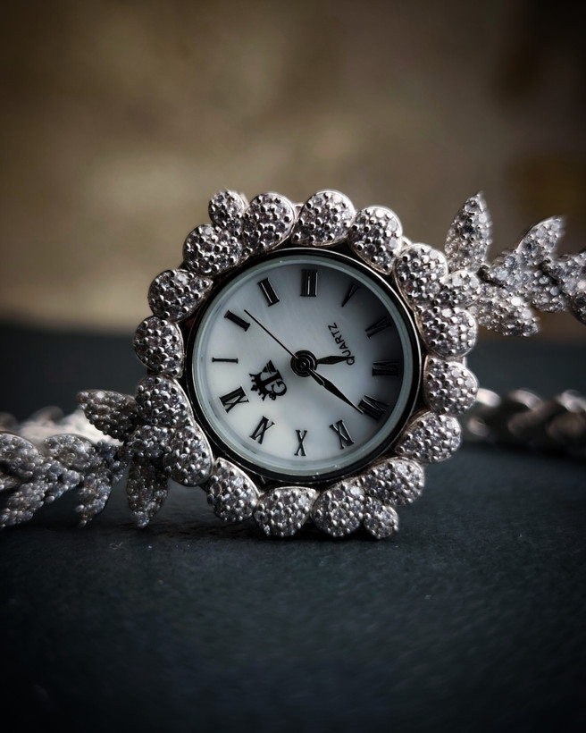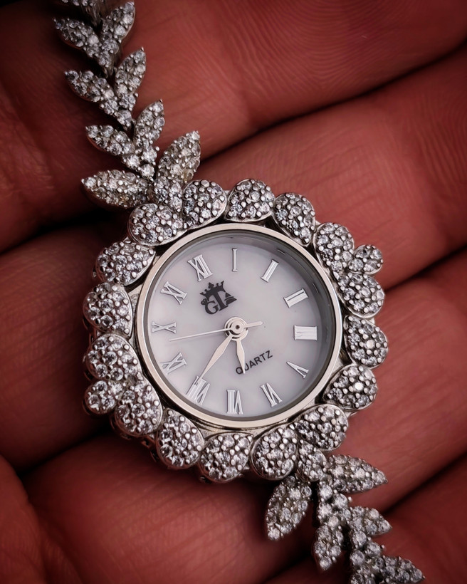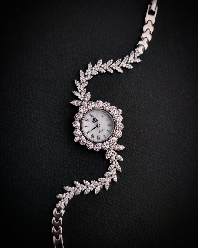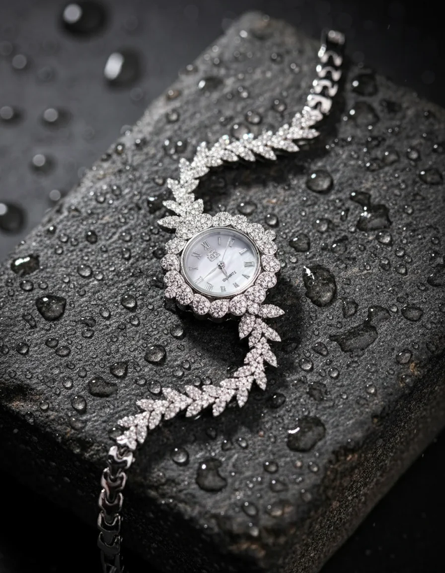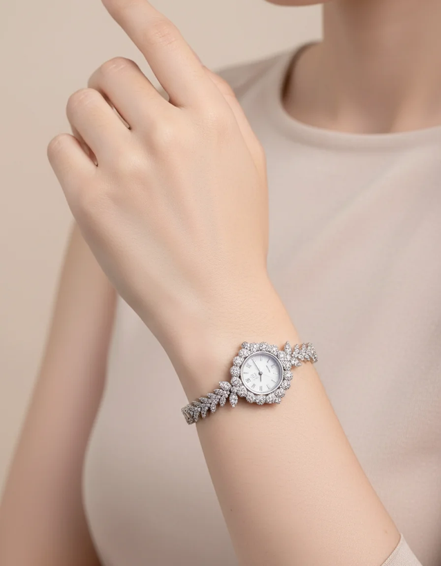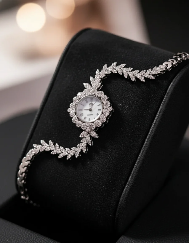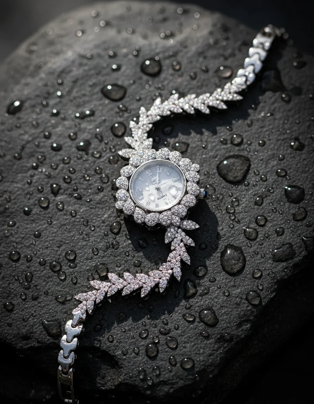 ⏱ ساعت مچی زنانه نقره با آبکاری رادیوم – طرح شاخه برگ الماسی ✨