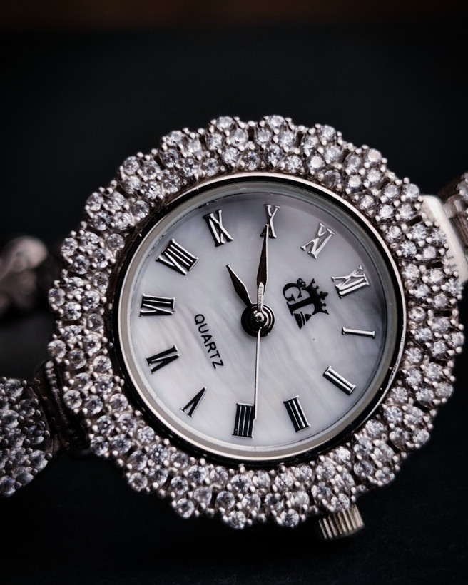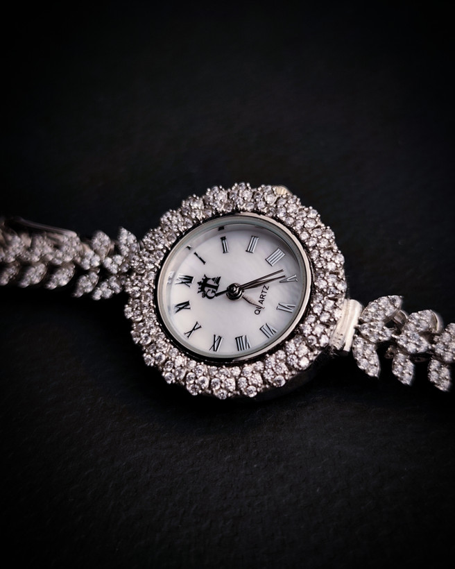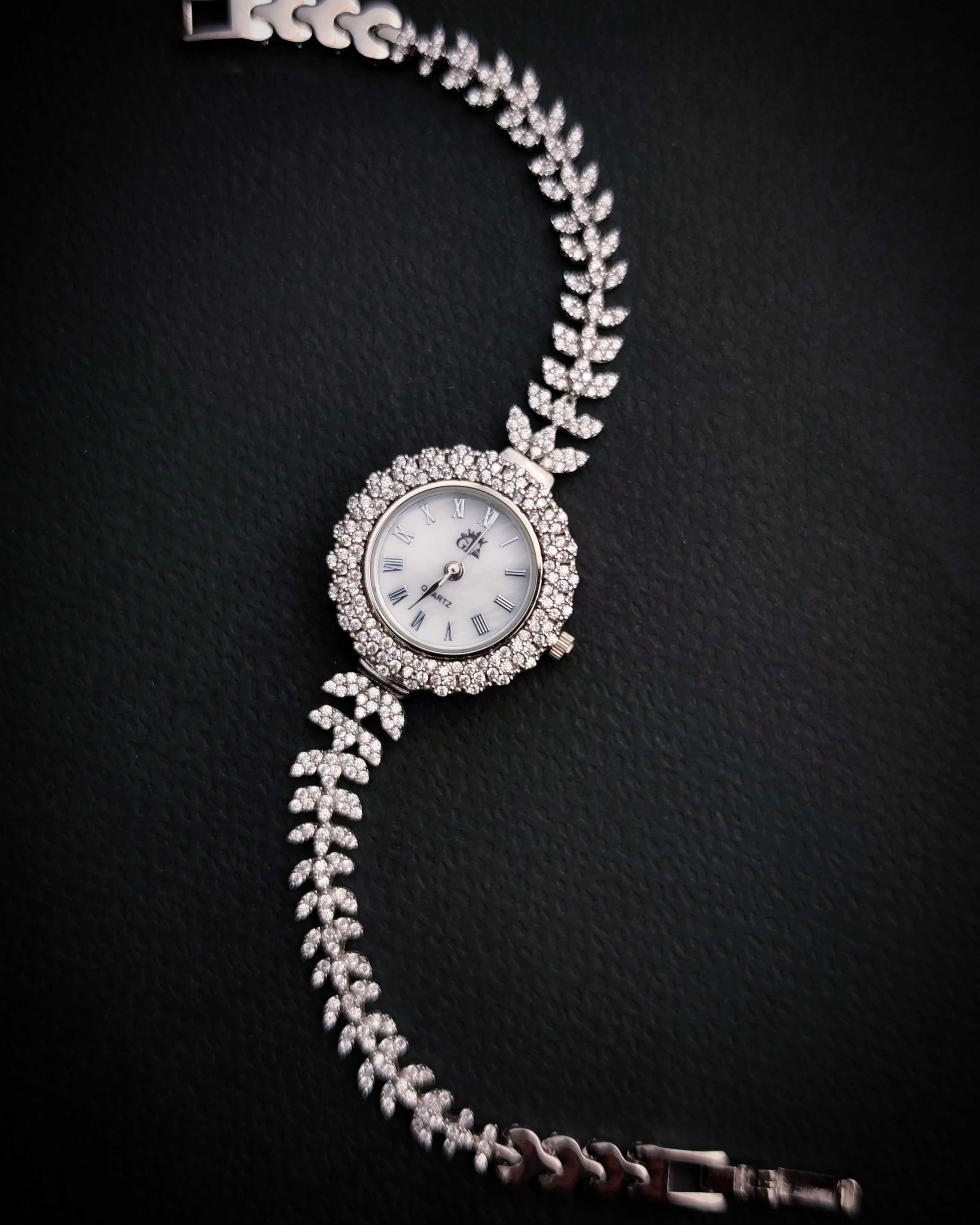 این ساعت رو باید مثل یه تکه جواهر بش نگاه کرد 💎✨. بندش طرح برگهای الماسیه، که تکتک نگینهاش مثل شبنم صبح برق میزنن. قاب گرد ساعت با یه حصار پر از سنگهای درخشان محاصره شده، طوری که نور رو میبلعه و دوباره با هزار تا جرقه پس میده 🔥