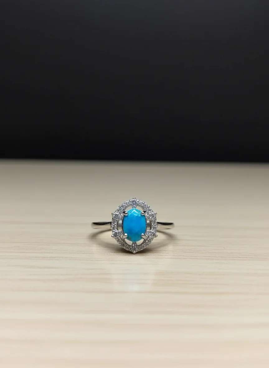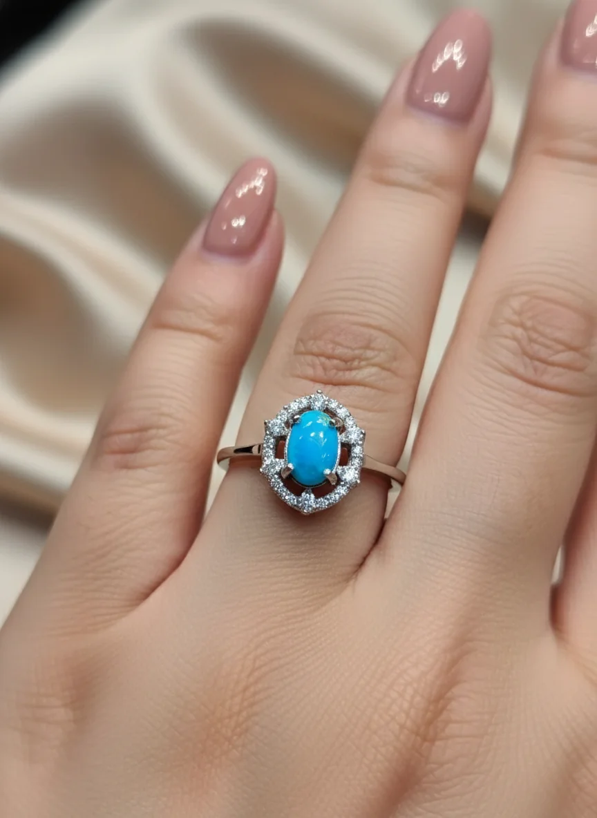 وسطش یه سنگ فیروزه خوشرنگ جا خوش کرده، از اون آبیهای نابیه که دل آدمو خنک میکنه و آرامش میریزه تو وجودت. دورش هم یه حلقهی ظریف از نگینهای براق هست که مثل هالهای از نور دور نگین اصلی میدرخشن — ترکیبش؟ یه شاهکار چشمگیر!
