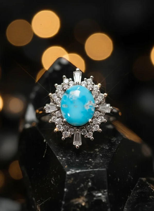 دورِ این سنگ آسمونی، نگینهای درخشان و ریز برلیان حلقه زدن و براش تاجی ساختن؛ یه ترکیب خیرهکننده از ظرافت و شکوه.