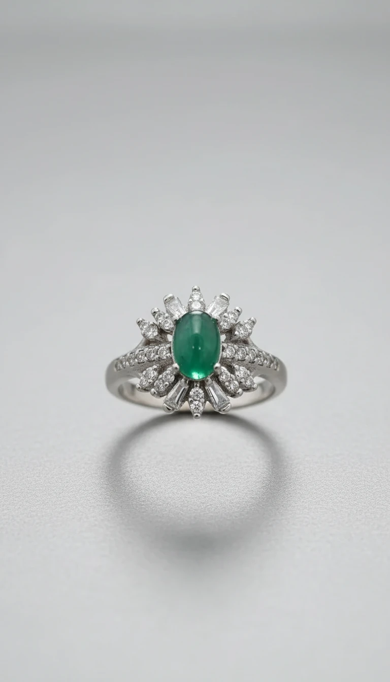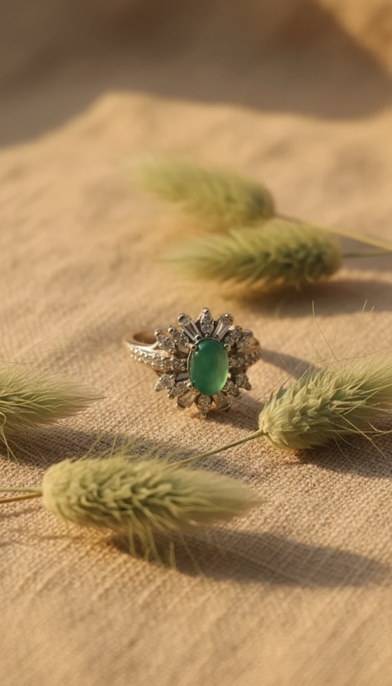 نگین خوشرنگ سبزش یه حس آرامش و انرژی مثبت خاصی داره، طوری که انگار طبیعتو با خودت حمل میکنی 🌿. دور نگین هم با کلی نگین کوچولوی درخشان تزئین شده که مثل ستارههای کوچیک دور ماه میدرخشن 🌟.