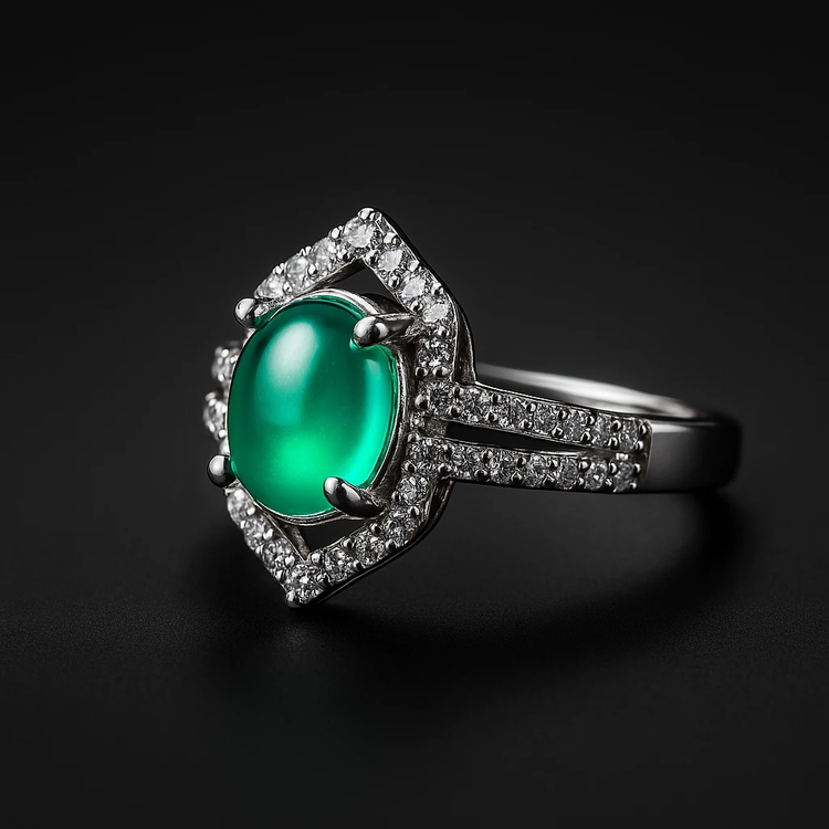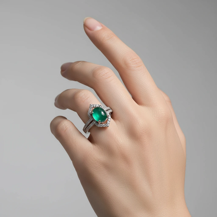 وسط انگشتر یک نگین سبز جذاب و چشمگیر قرار گرفته؛ رنگی که از دور هم خودش رو نشون میده و تناسبش با پوست دست فوقالعادهس 💚✨