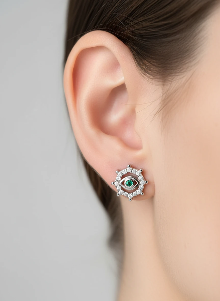 گوشواره نقره طرح چشم نظر با نگین سبز خوشرنگ 💚