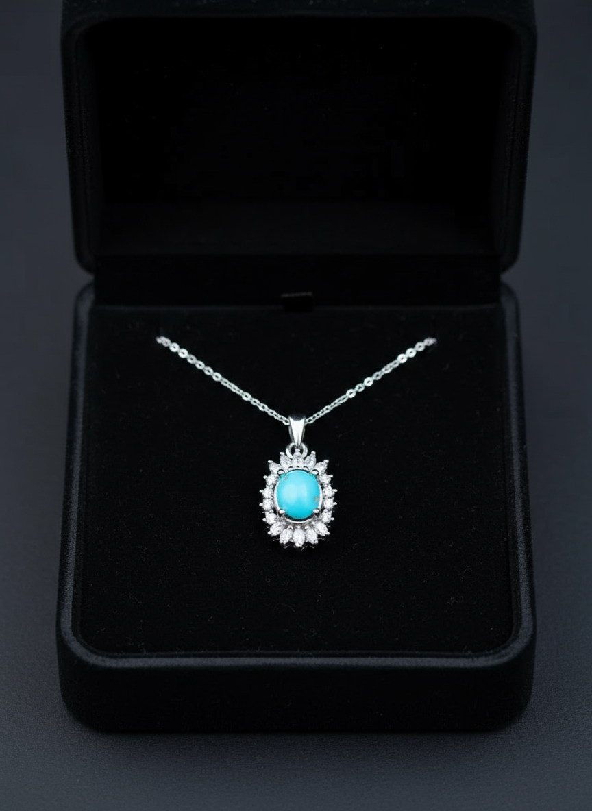 گردنبند زنانه ، نقره عیار 925 ، آبکاری رادیوم ، سنگ فیروزه نیشابور ، نقره بقیع