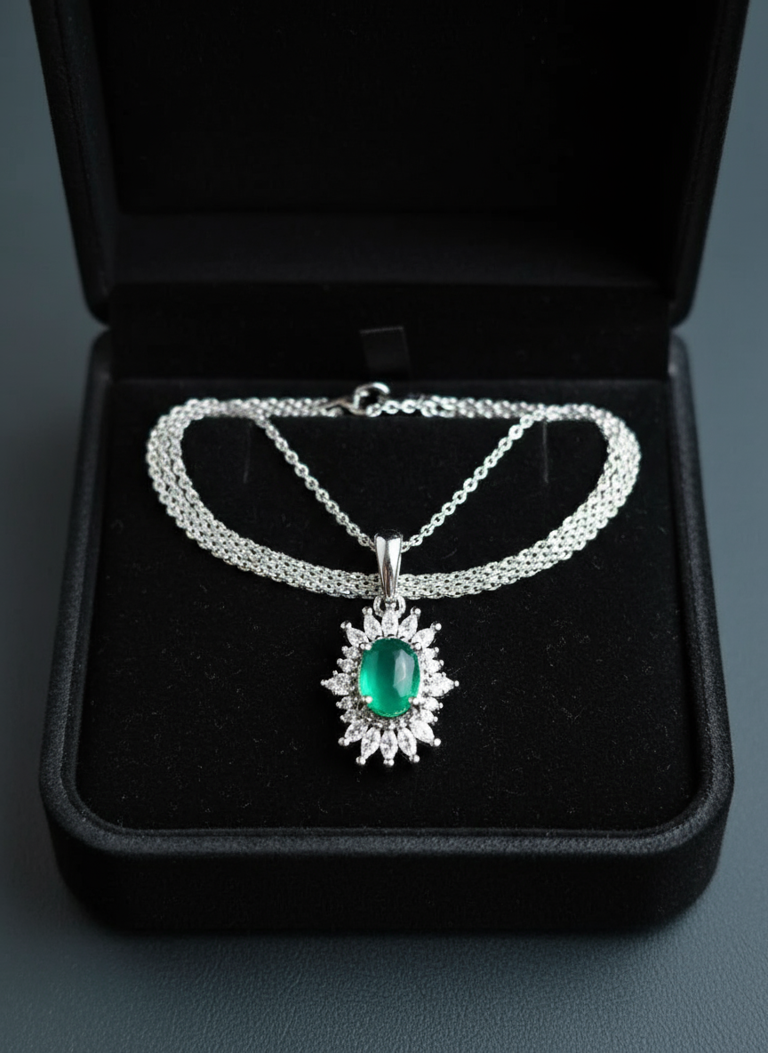 گردنبند زنانه ، نقره عیار 925 ، آبکاری رادیوم ، سنگ عقیق سبز، نقره بقیع