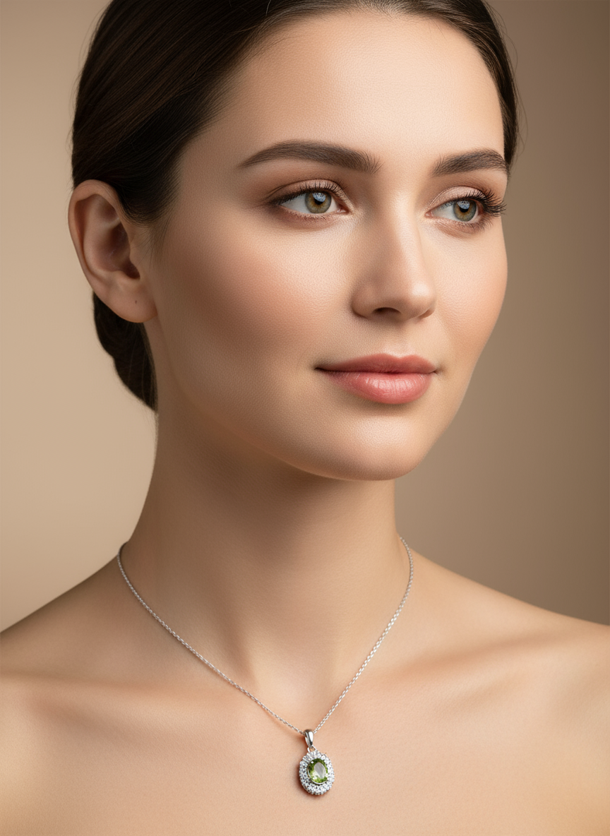 گردنبند زنانه ، نقره عیار 925 ، آبکاری رادیوم ، سنگ زبرجد درجه 1 ، نقره بقیع