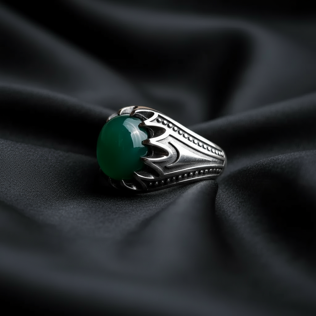 💚 انگشتر مردانه نقره عقیق سبز با رکاب شعلهای هنری