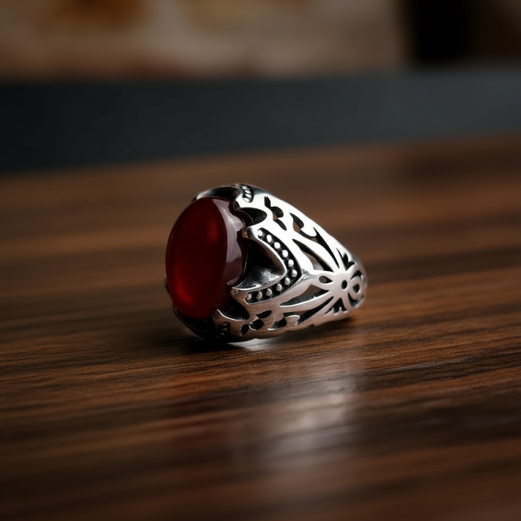 انگشتر مردانه نقره با عقیق سرخ و رکاب مشبک هنری 🔥
