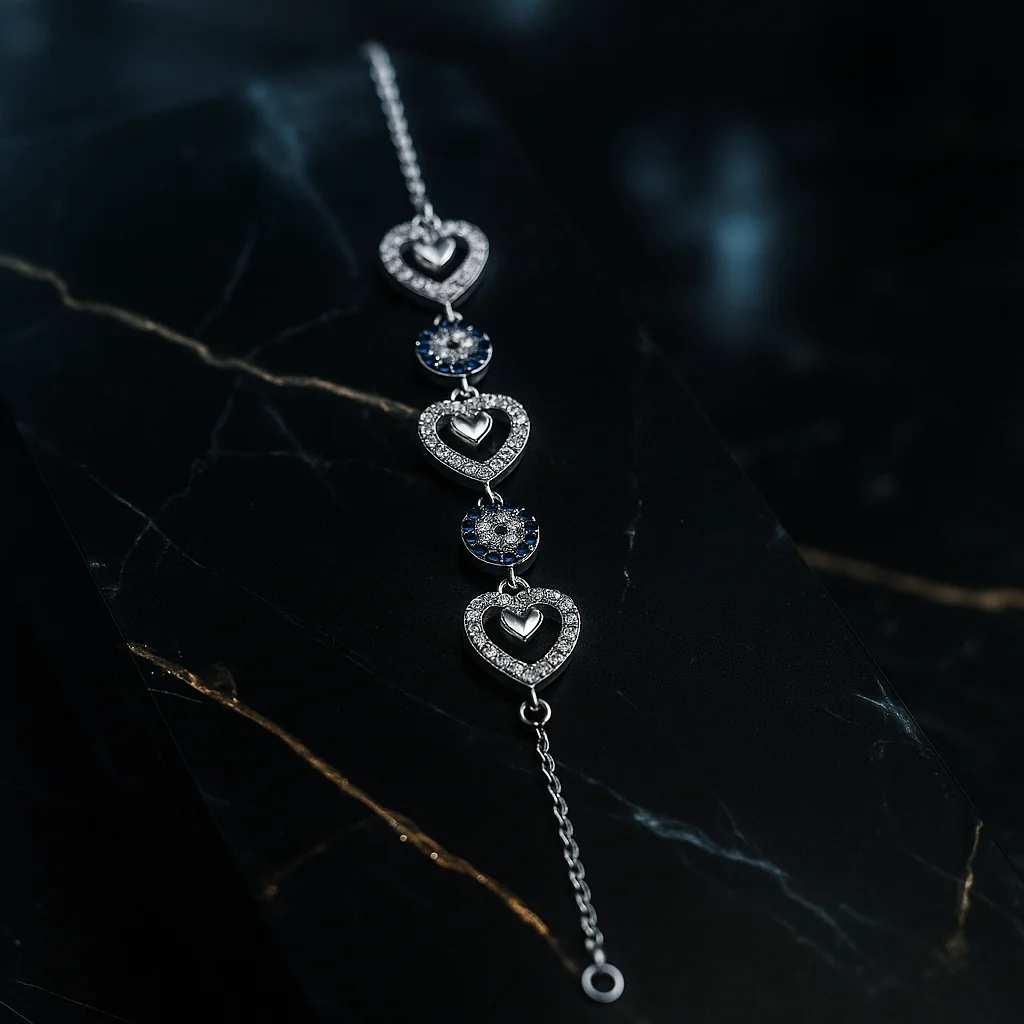 دستبند نقره ۹۲۵ اصل با آبکاری رادیوم، ترکیبی دلبر از قلبهای درخشان و چشم نظر آبی که هر نگاه رو میخ کوب میکنه 💙✨